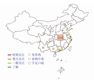 | 图 2 近期国内需关注的传染病疫情和突发公共卫生事件 示意图(截至2014年8月31日) Figuer 2 Recent concerned infectious diseases and public health emergencies in China (as of 31August 2014) |