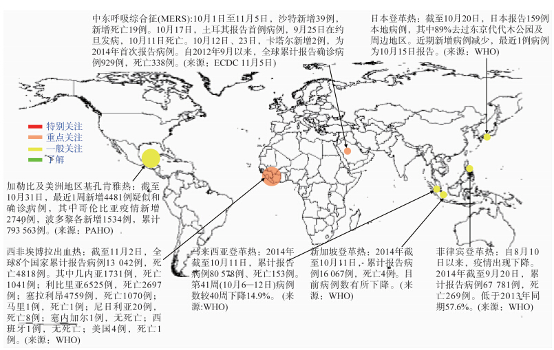 | 图 1 近期全球需关注的传染病疫情和突发公共卫生事件示意图(截至2014年11月5日) Figuer 1 Recent communicable disease outbreaks and public health emergencies with global concern (as of 5 November 2014) |