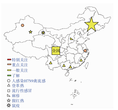 图 2 近期国内需关注的传染病疫情和突发公共卫生 事件示意图(截至2014年11月5日) Figuer 2 Recent communicable disease outbreaksand public health emergencies with great concern in China (as of 5 November 2014) |
