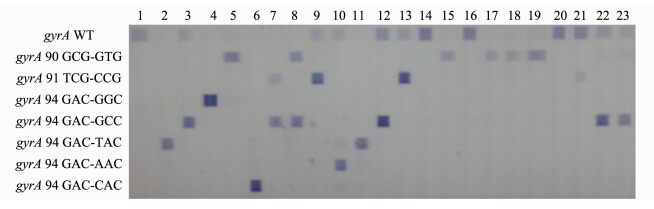 | 图 1 反向斑点杂交图谱 Fig.1 Reverse dot blot hybridization map 注:行:探针;1:H37Rv; 2~23:临床分离菌株。 菌株1、14、16、20、21与野生型探针杂交未突变;菌株5、15、17~19与pm1突变型探针杂交,突变类型为Ala90Val;菌株9、13与pm2突变型探针杂交,突变类型为Ser91Pro;菌株4与pm3a突变型探针杂交,突变类型为Asp94Gly;菌株3、12、22、23与pm3b突变型探针杂交,突变类型为Asp94Ala;菌株2、11与突变型探针pm3c杂交,突变类型为Asp94Tyr;菌株10与pm3d突变型探针杂交,突变类型为Asp94Asn;菌株6与pm3e突变型探针杂交,突变类型为Asp94His;菌株7与pm2、pm3b突变型探针杂交,突变类型为Ser91Pro、Asp94Ala;菌株8与pm1、pm3b突变型探针杂交,突变类型为Ala90Val、Asp94Ala。 |