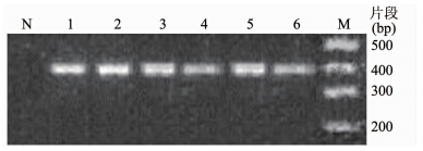 | 图 1 DHA-120150508型PCR产物电泳结果 Fig.1 Electropherogram of PCR products of AmpC-β lactamase gene DHA-1 注:N:阴性对照; 1~5:DHA-120150508阳性株; 6:阳性对照; M:Marker |