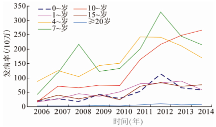 2 结果 2.1 疫情概况《中国疾病预防控制信息系统》从2005年开始报告水痘病例,但衢州市2005年仅报告水痘病例10例,因此不列入分析。20062014年全市共报告水痘病例5425例,年平均报告发病率为24.12/10万;其中2012年报告病例数最多,报告发病992例,占所有报告发病数的18.19%;2006年报告病例数最少,报告发病208例,占所有报告发病数的3.83%。按照年龄将人群分为0~岁、1~岁、4~岁、7~岁、10~岁、15~岁和≥20岁,各年龄组各年份的发病情况见表 1。由表 1可见,衢州市20062014年水痘病例的平均发病年龄呈上升趋势,其中20062007年、20092011年水痘的高发年龄段为4~6岁组,2008年和2012年的高发年龄段为7~9岁,而20132014年的高发年龄段为10~14岁,整体呈现后移趋势。由图 1可见,0~岁、1~岁、15~岁和≥20岁组的发病率变动幅度较小,4~岁组和7~岁组呈现发病率先上升而后又下降的趋势,而10~岁组的发病率一直呈上升趋势。