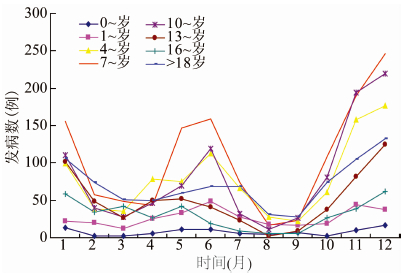 全年112月均有病例报告,12月报告病例数最多(1015例,占18.71%),8月报告病例最少(117例,占2.16%),月平均报告452例。将人群按年龄分为0~岁(无免疫人群)、1~岁(学龄前)、4~岁(幼托儿童)、7~岁(小学初段)、10~岁(小学高段)、13~岁(初中)、16~18岁(高中)和18岁以上成人,各年龄发病的月分布情况见图 2。由图 2可见,0~岁、1~岁、13~岁、16~岁及18岁以上成人组各月发病变化不大;而4~岁、7~岁和10~岁组的发病呈现两个高峰,一个是56月,另一个是11月至次年1月,符合呼吸道传染病的传播特点,也与学生的在校时间一致。