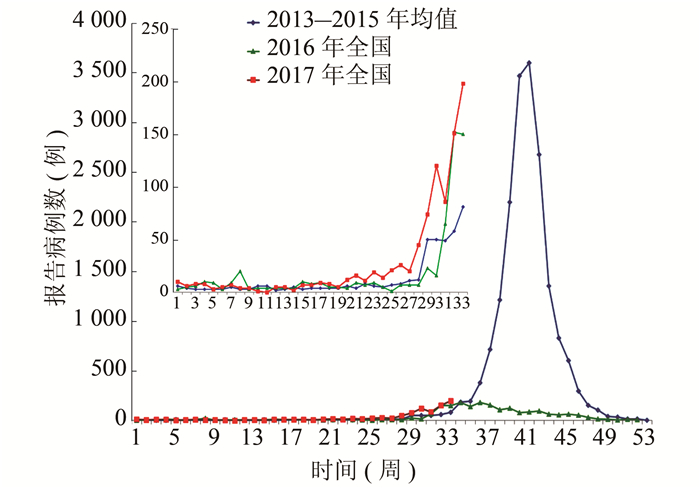 图 1 2013-2017年全国登革热病例数周分布(截至8月31日) Figure 1 Weekly distribution of dengue fever cases in China, 2013-2017 (as of 31th August) |