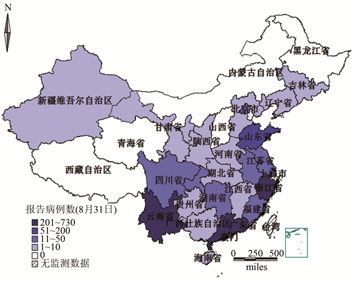 图 2 2017年全国登革热报告病例分布(截至8月31日) Figure 2 Distribution of dengue fever cases in China, 2017 (as of 31th August) |