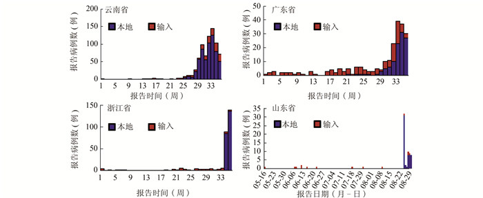 2.1.5 重点省份输入病例和本地病例时间分布广东省从第1周报告了输入病例,截至第20周报告病例均为输入病例;截至8月31日,广东省共报告病例224例,其中输入病例113例(50.4%),本地病例111例(49.6%)。云南省从第1周报告了输入病例,截至第24周报告病例均为输入病例;截至8月31日,云南省共报告病例730例,其中输入病例141例(19.3%),本地病例589例(80.7%)。浙江省从第1周报告了输入病例,截至第33周报告病例均为输入病例;截至8月31日,浙江省共报告病例266例,其中输入病例45例(16.9%),本地病例221例(83.1%)。山东省自2月15日报告第1例病例(为输入病例)以来,截至8月26日报告的病例均为输入病例;截至8月31日共报告病例73例,其中本地病例58例(79.5%),输入病例15例(20.5%)。