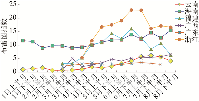 图 4 Ⅰ类省份8月布雷图指数(截至8月31日) Figure 4 Brett index in provinces at high risk in August 2017 (as of 31 August) |